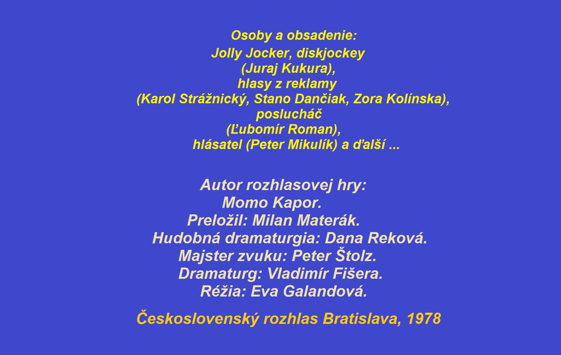 Rozhlasovú hru Jolly Jokey som počula ako 13-ročná a bol to veľmi silný zážitok. Ostalo mi v pamäti pár bonmotov, vtipov, ktoré používam dodnes. Veľmi ste ma potešili, srdečne Vám ďakujem. Komentár píšem ešte pred ‘novým’ vypočutím hry. Motívom k dnešnému googleniu informácií o hre bola stredajšia (16.3.) relácia Ars litera v rádiu Devín. Odznel v nej úryvok pri príležitosti 75-tych narodenín Juraja Kukuru.