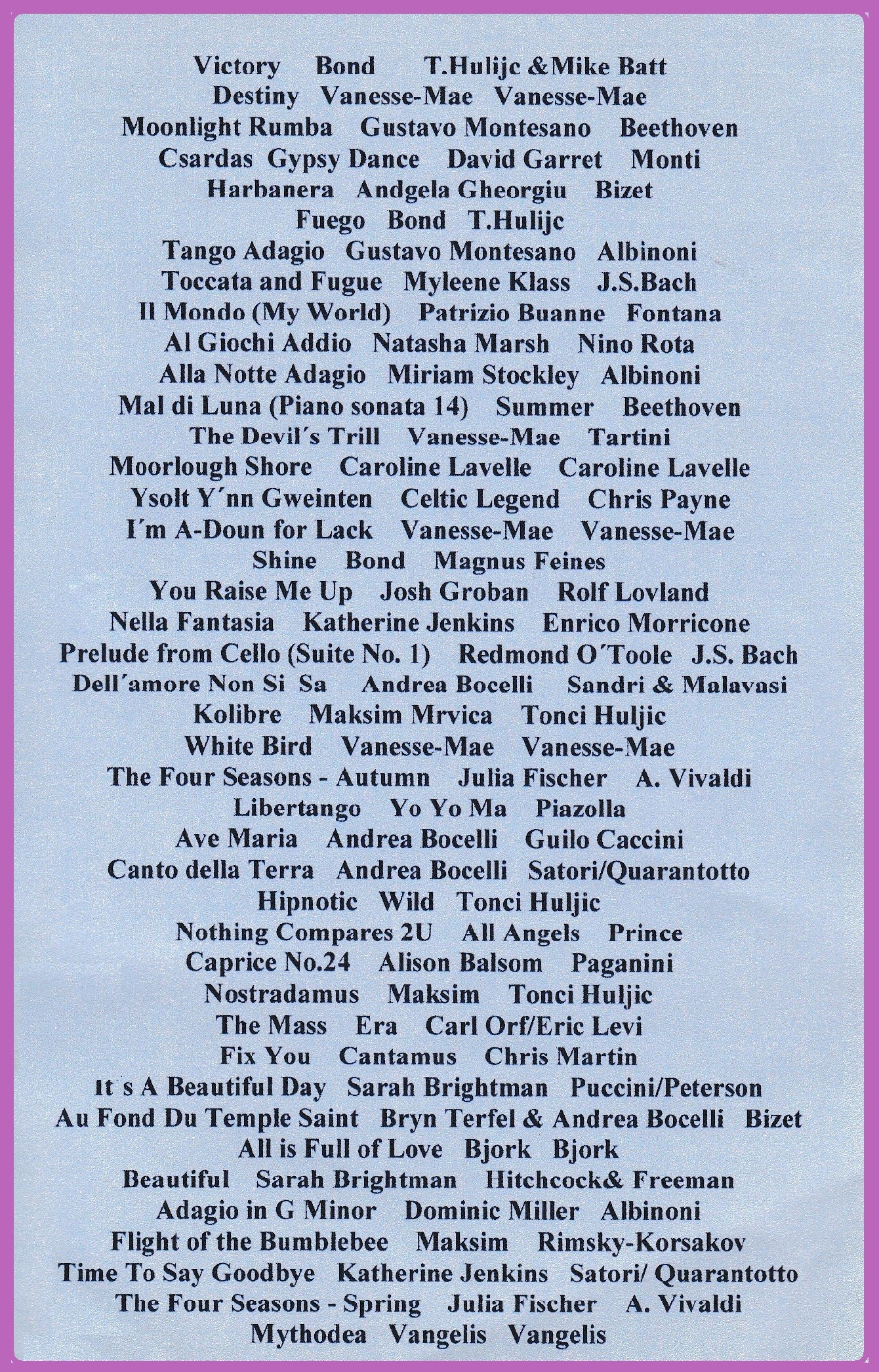 12:45 J. Pachelbel - Kánon D-dur pre trojo huslí a generálbas, 18:20 A.Dvořák - IX. Symfónia E- mol, Z nového sveta, Largo, 25:30 J.S. Bach - Air z III. Suity D-dur